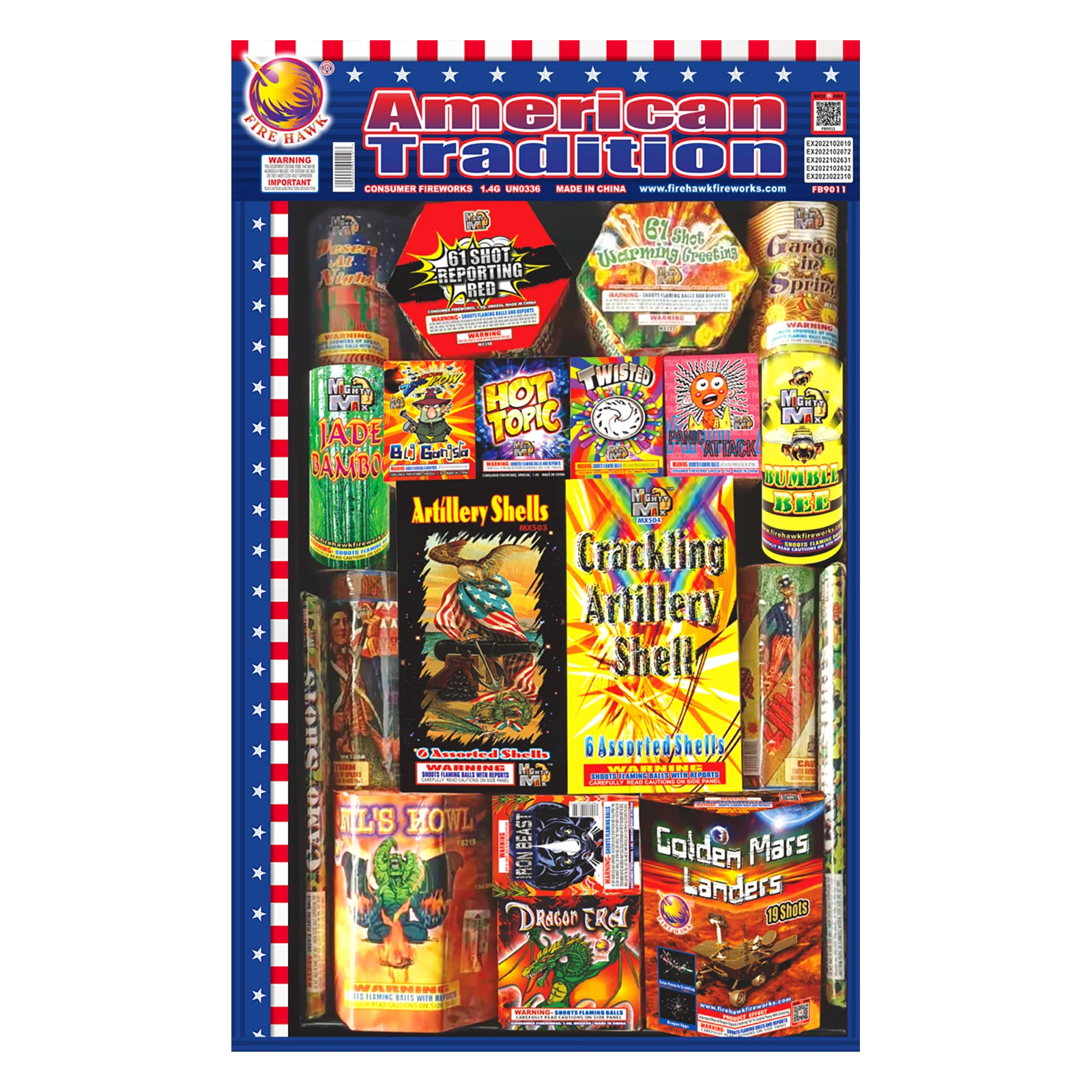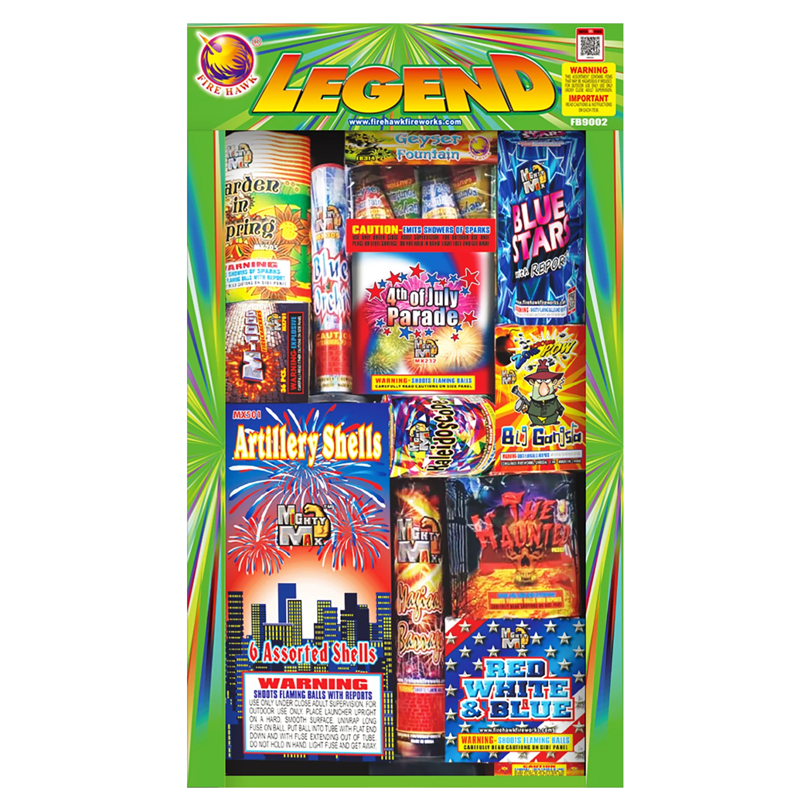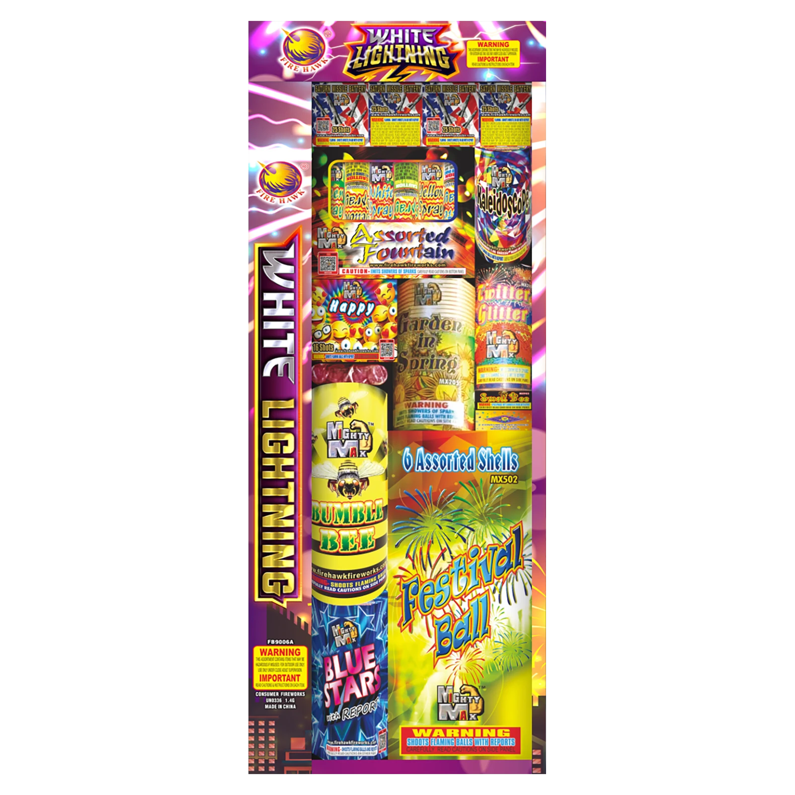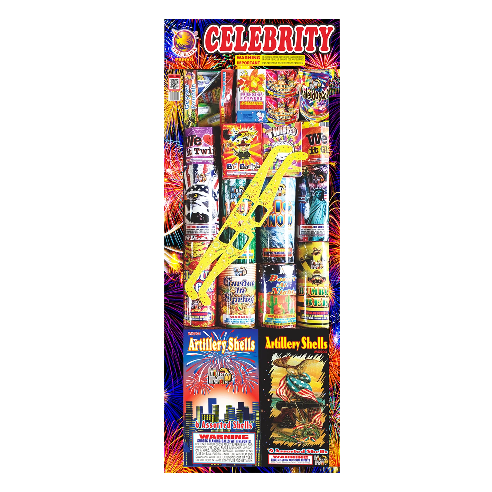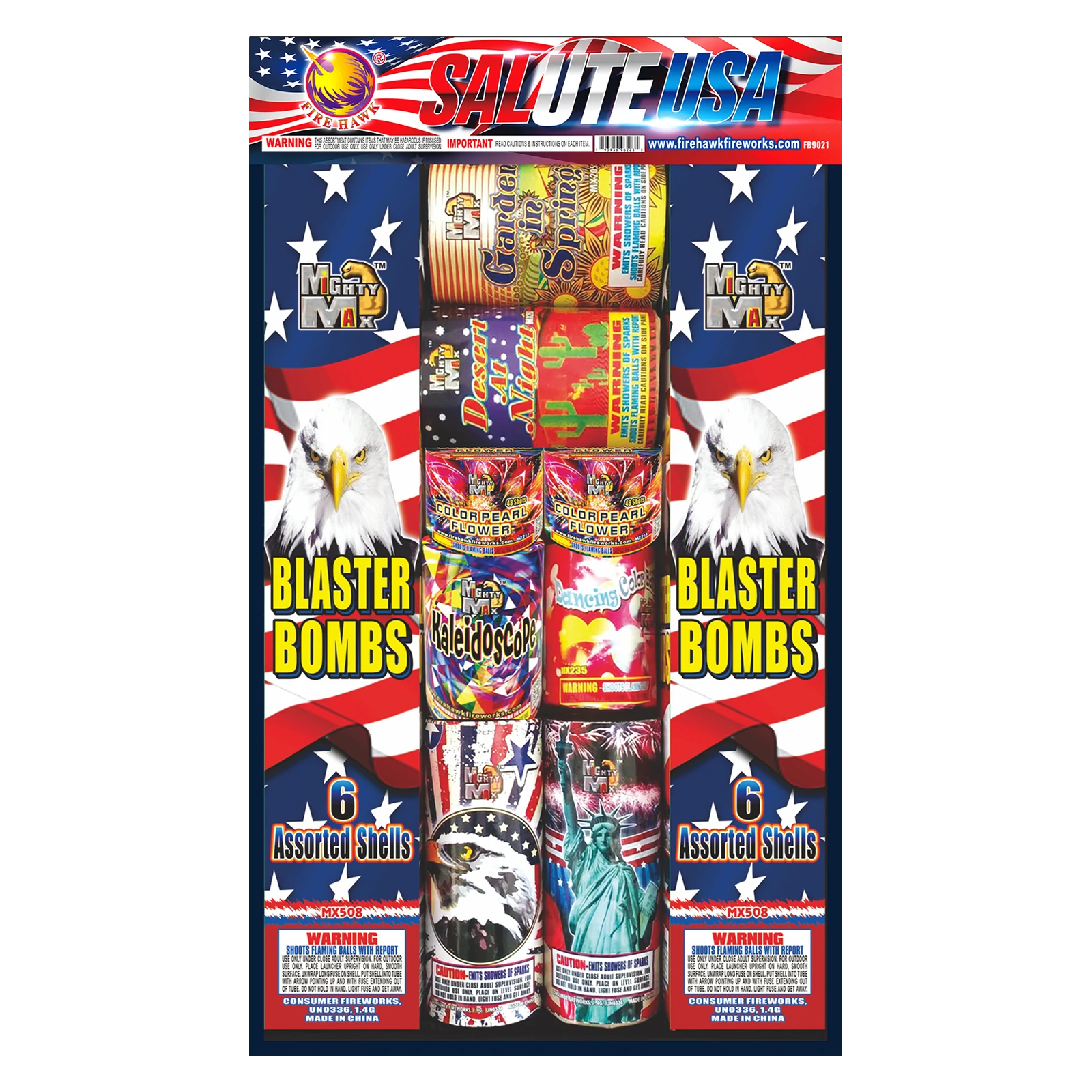 2 box MX508 1.5" Blaster Bomb Artillery Shells (Artillery Shells, Multiple Shots & Fountains) 1 pc MX205 7 Shot Garden in Spring 1pc MX207 7 Shot Desert At Night 2pc MX211 48 Shot Color Pearl 2pc MX321 July 4th (JF4) Fountain 1pc MX235 Dancing Color Ball 1pc MX208 Kaleidoscope