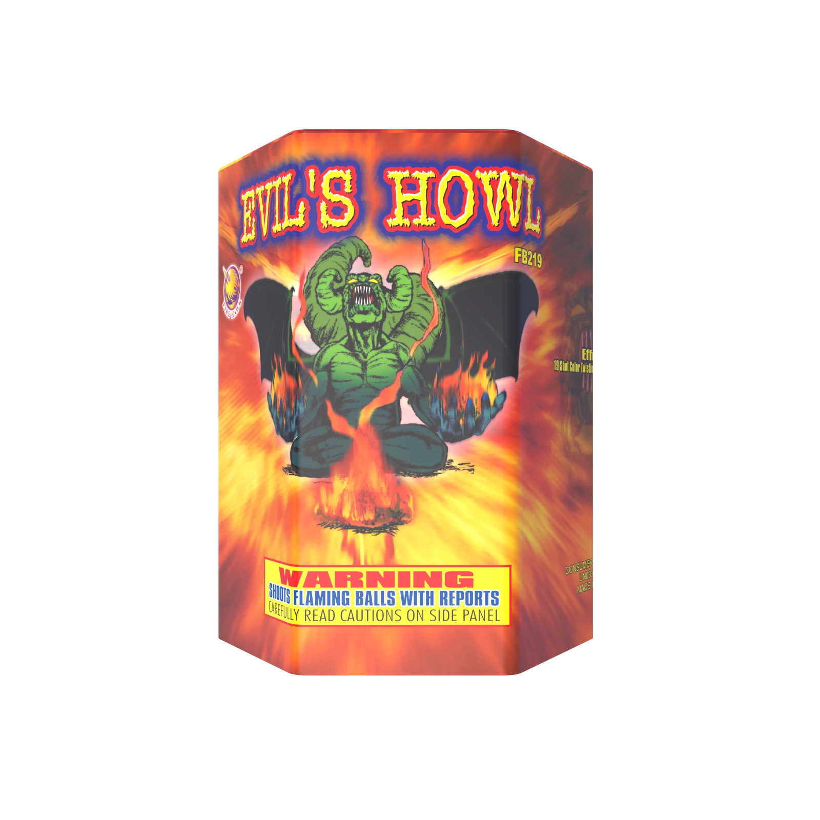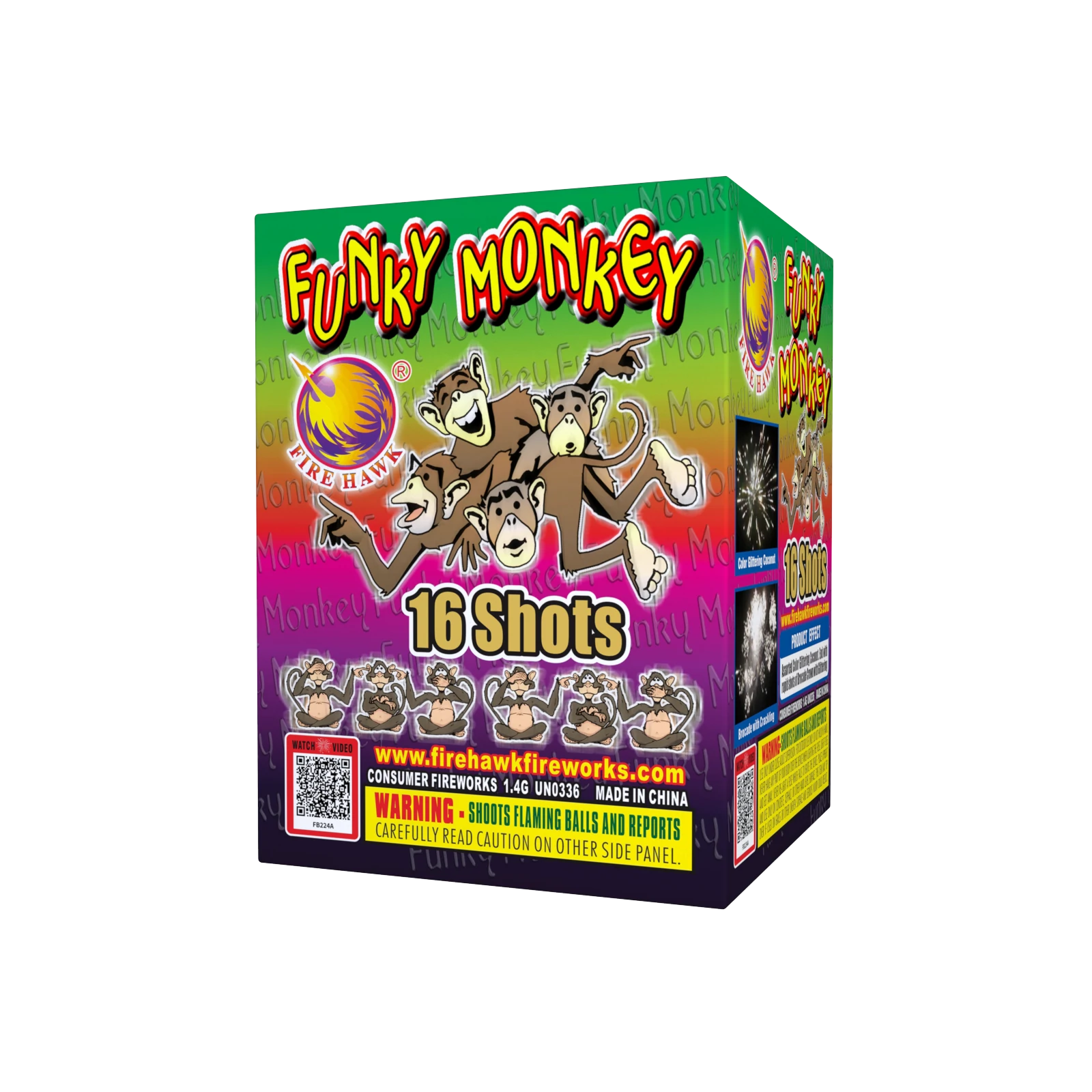 Pounding blows of silver swirling tails to red and white palms then whistling tails to white glitter with blue stars. Rows of silver swirling tails to green palm with purple stars and whistling tails to silver fish with blue stars. Then, brocade tails to brocade with delayed crackling. 25 SHOTS