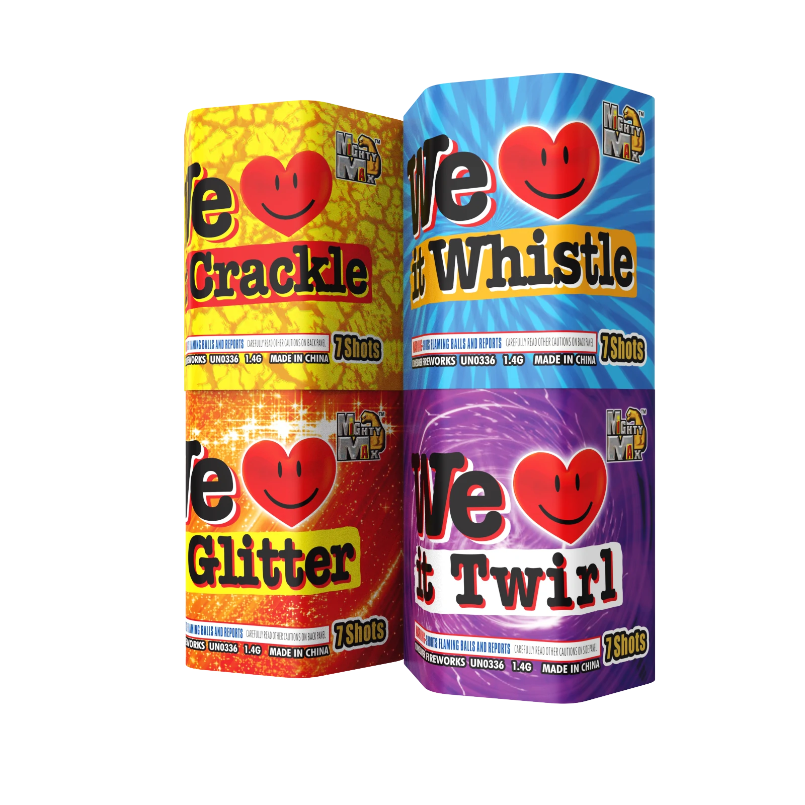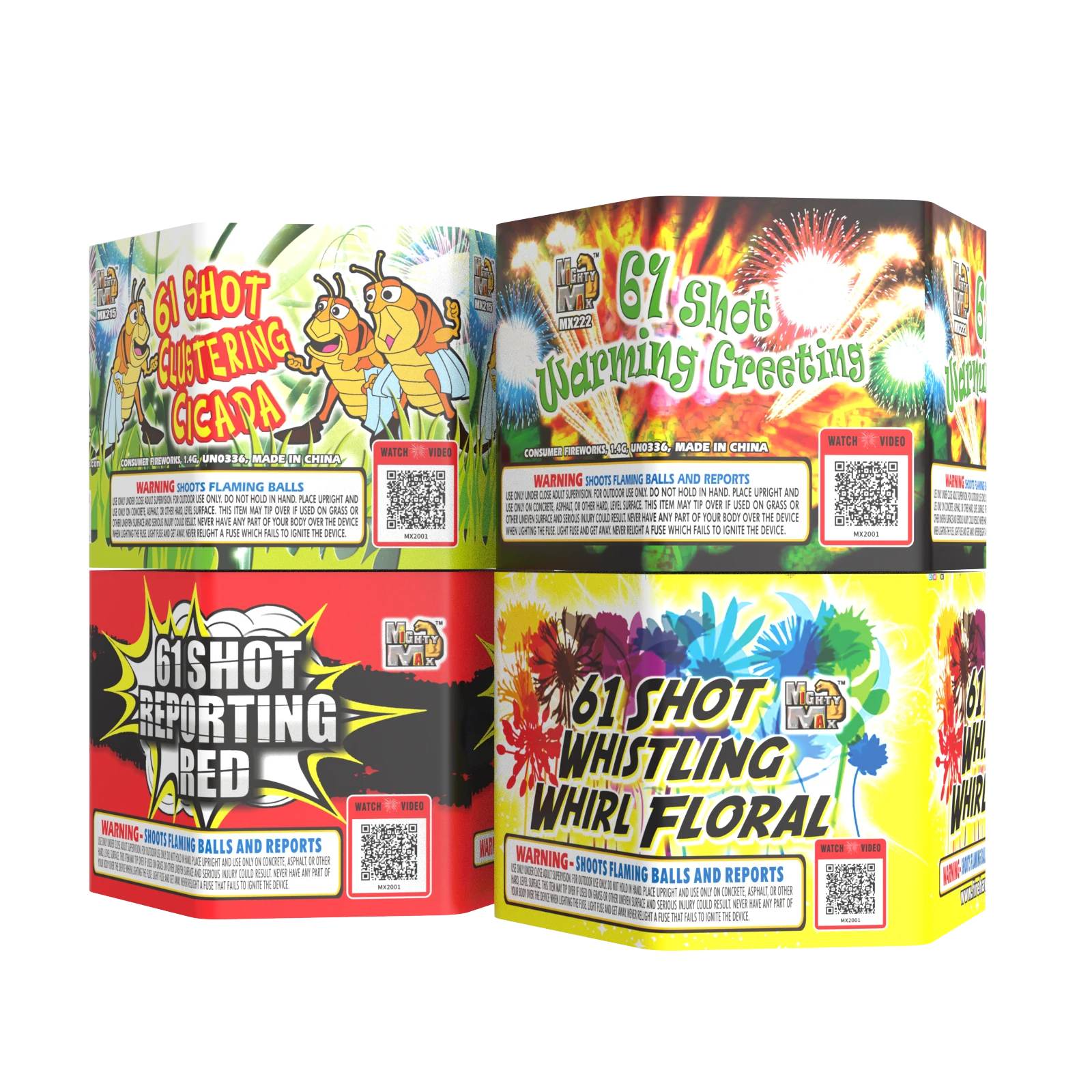 GREAT VALUE SMALL CAKES or ASSORTMENT FILLERS MX253A Jolt - Green to Purple & Green Glitter, Blue to Blue & Gold Glitter, Silver to Coconut Crackling MX253B Xtreme - Red Tail to Brocade, Blue Tail to Blue Crackling Rain MX253C Fire Hazard - Red Tail to Red Crackling, Green Tail to Green Crackling, Blue Tail to Blue Crackling MX253D Red Alert - Red Tail to Red Coconut, Green Tail to Green Coconut, Silver Tail to Silver Coconut