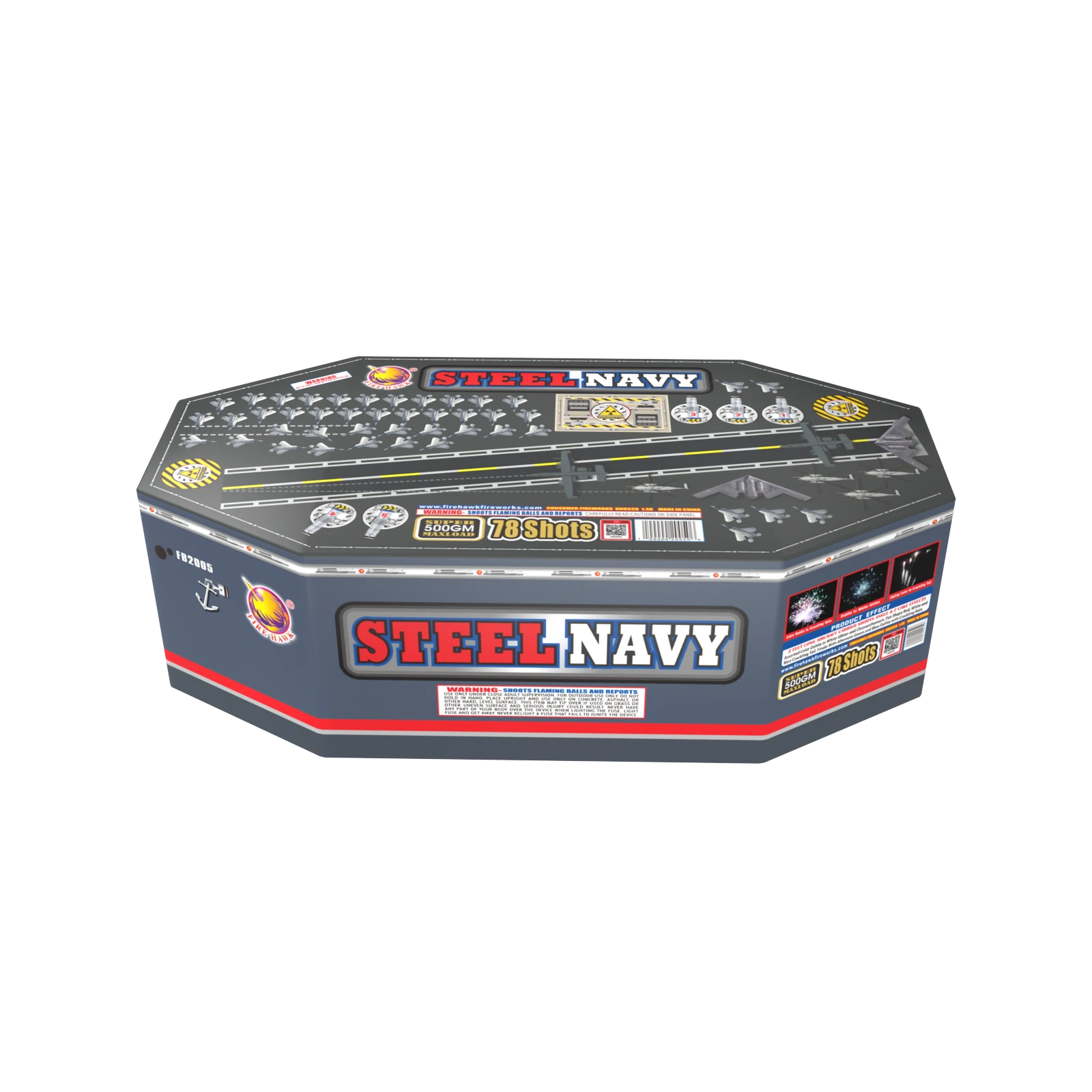2 FEET LONG AIRCRAFT CARRIER SHOOTS ANGLE & Z CAKE EFFECTS Assorted Color Dahlia to White Glitter and Chrysanthemum, Fan Shape Red and Green Crackling Tail. Finale With Alternate Green and Purple Dahlia with Crackling Rain