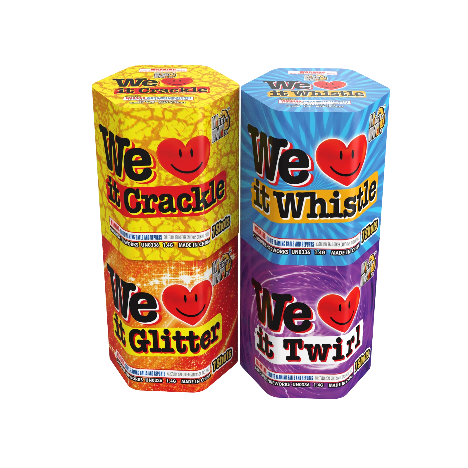 GREAT VALUE SMALL CAKES or ASSORTMENT FILLERS MX252A We Love it Crackle - Red Tail to White Glitter, Green Tail to Green Glitter, Gold Tail to Crackling Rain MX252B We Love It Whistle - Whistle to Red Tail, Red and White Glitter MX252C We Love It Glitter - Gold Tail to Gold, Silver Tail to Silver, Green Tail to Green Glitter MX252D We Love it Twirl - Gold Tail to Gold Glitter, Red Tail to Color Peony, Green to Twister