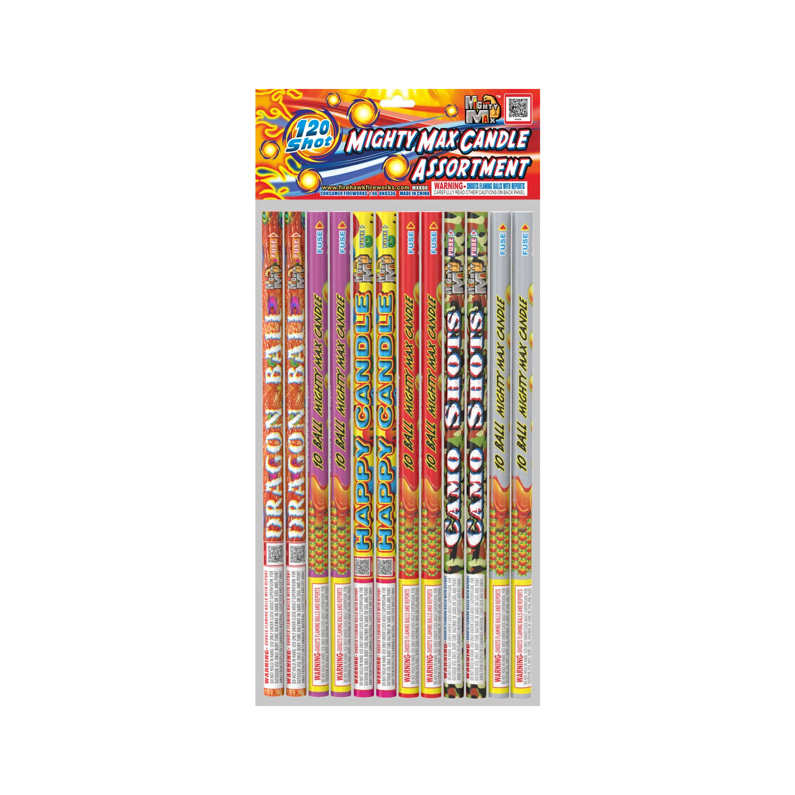 Consist of 2 pcs each of MX601 10S Happy Candle MX603 10S Dragon Ball MX604 10S Camo Shots FB6010A 10S Red/Green w/Color Bouquet FB6010B 10S Blue/Silver Star w/Crackling FB6010RP 10S Red/Gold star w/Report